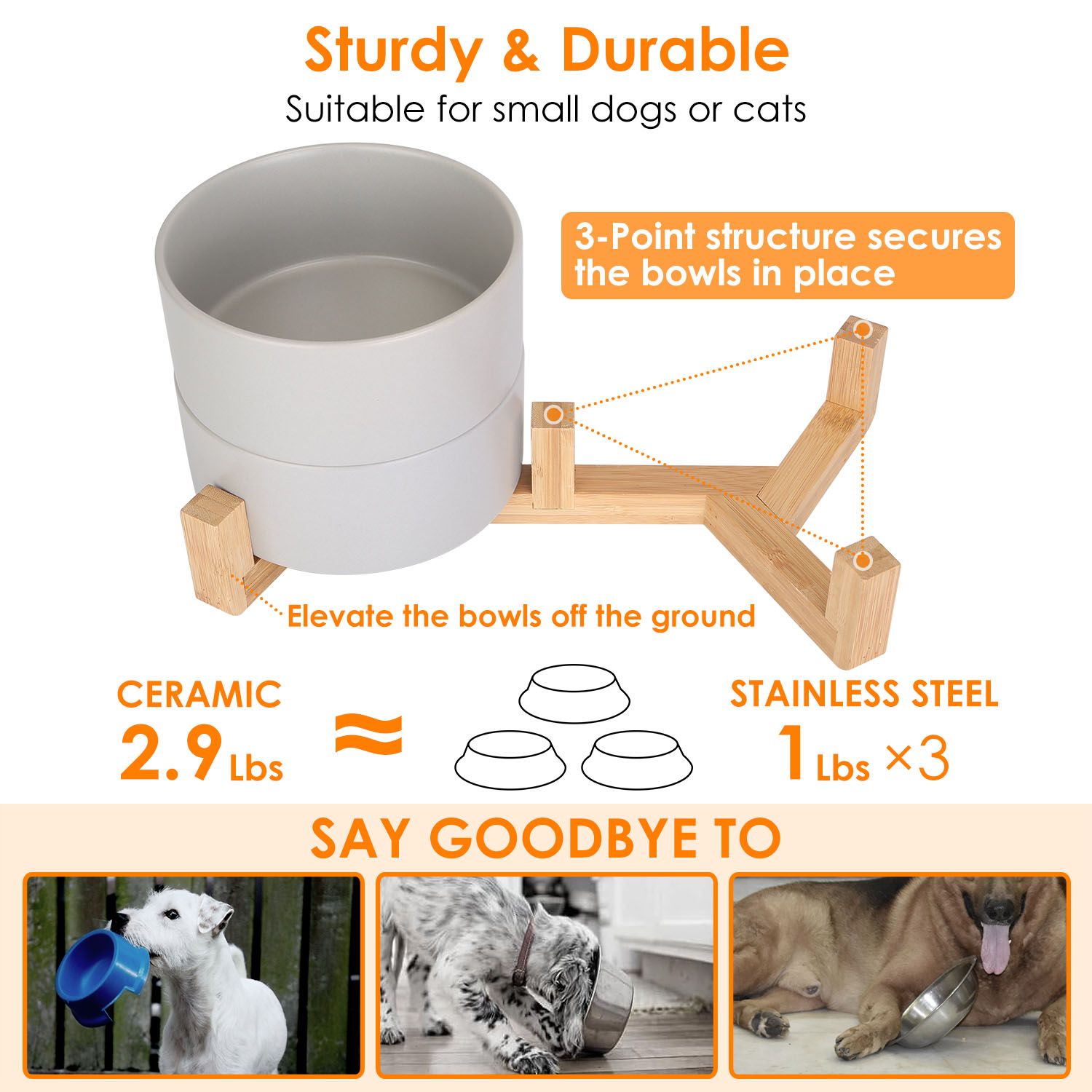 *Elevated Wooden Stand*:The wooden stand elevates the bowls off the ground,promoting better posture and digestion for your pet. The 3-point structure can also help secure the bowls in place to prevent falling.