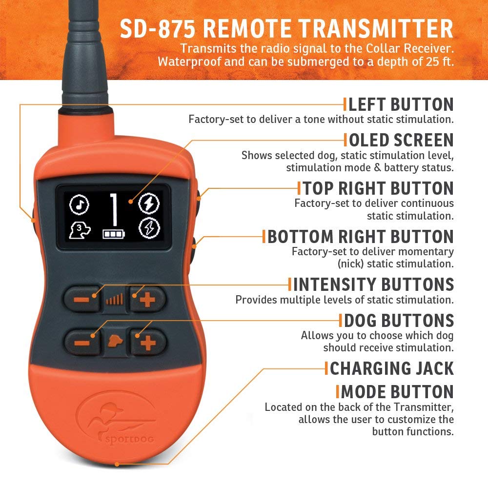 The SportTrainer 875 is designed for field training and far ranging hunting dogs (up to 1/2 mile). Featuring an easy-to-read, bright OLED screen, you can view the selected dog, static stimulation level and mode, and battery status, with just a glance. This, combined with large plus/minus buttons to easily toggle among dogs and stim levels, makes the SD-875 especially suited for multi-dog training.